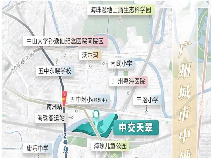 中交天翠最核心的交通优势,在于其紧邻地铁2号线与广佛线交汇的南洲站。这一地理位置的选择,极具战略眼光。南洲站作为广州轨道交通网络中的关键枢纽,不仅连接着海珠区的南北大动脉,更打通了通往佛山乃至整个珠三角地区的快速通道。