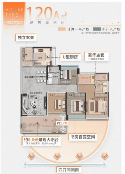 120㎡四房两厅两卫(经典改善):分 A、B 两种布局,实测套内使用面积 118㎡,得房率 98%。A 户型客厅与卧室打通后可形成 45㎡大平层级客厅,主卧可改造为带步入式衣帽间的奢华套间;B 户型为横厅设计,带独立入户花园(面积约 4㎡),四个房间面积均在 9-12㎡之间,空间匀称实用,适合三代同堂家庭。
