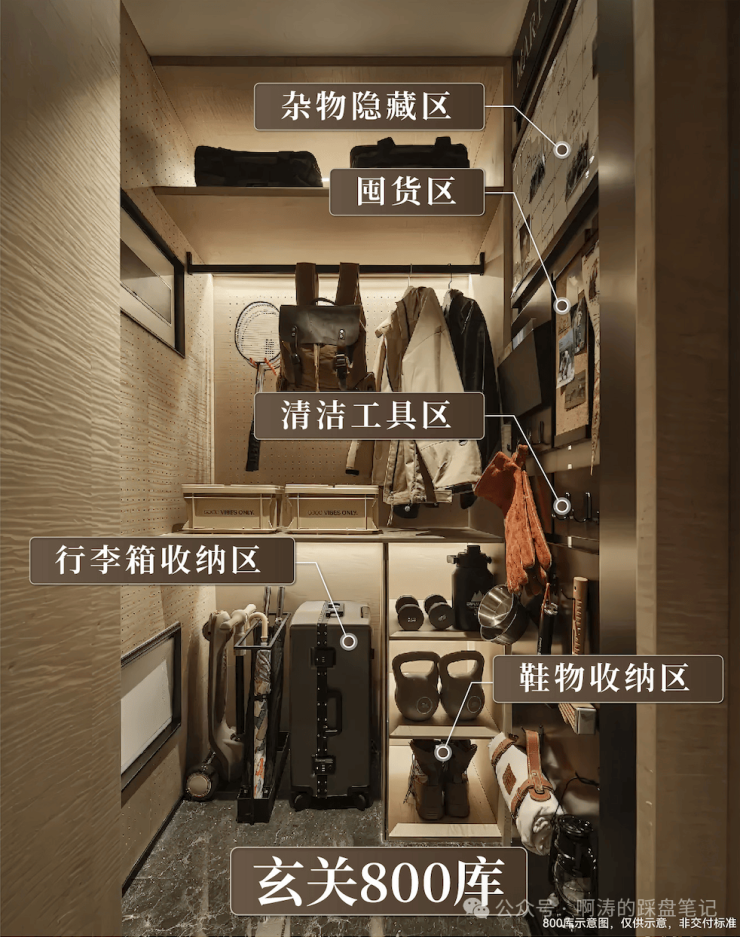 收纳亮点:玄关处设置独立 800 库收纳间,可容纳全家人鞋子、行李箱、婴儿车,门口永远整洁;卧室均带衣柜预留位,收纳空间充足