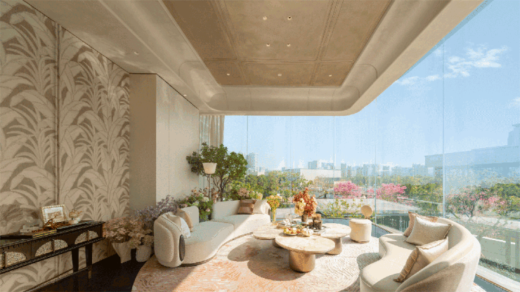 空间布局:户型方正、动静分区,入户独立玄关(带收纳间),餐客厅一体化(面宽 4.5 米),连接南向观景阳台(长约 7 米),空间奢阔、气派十足