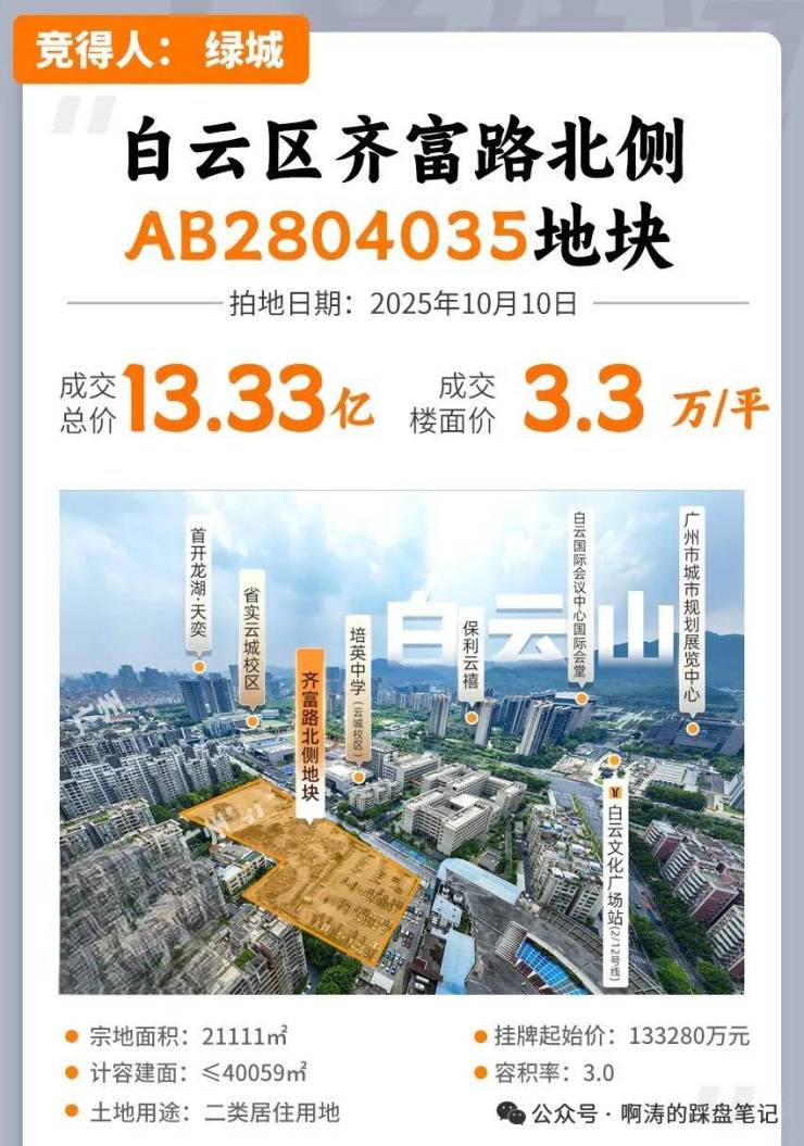 2025 年 9 月,绿城以总价 13.33 亿元拿下白云区齐富路北侧地块,名义楼面价 3.3 万元 / 平方米,地块可建设用地面积 1.3 万平方米,总建筑面积 4 万平方米,容积率 3.0。我们坚持 “低密改善、生态宜居” 的规划理念,结合地块限高 80 米的要求,打造白云新城首个新规改善纯住宅,整体为小高层 + 高层组合,楼栋横向一字排布,无遮挡、采光通风极佳。下面给大家详细拆解项目核心参数,所有数据均来自广州市住建局备案文件,真实可查。