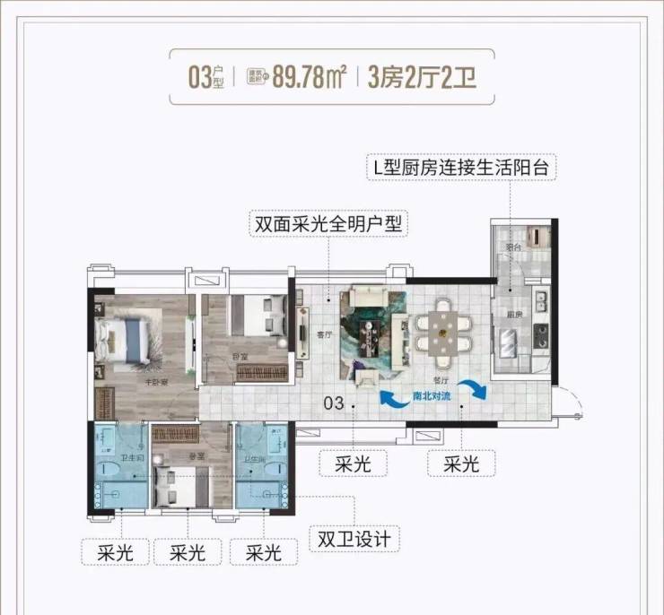 89平米三房两厅:南北对流,通透明亮,多开间看珠江及小蛮腰,享受无敌视野江景。