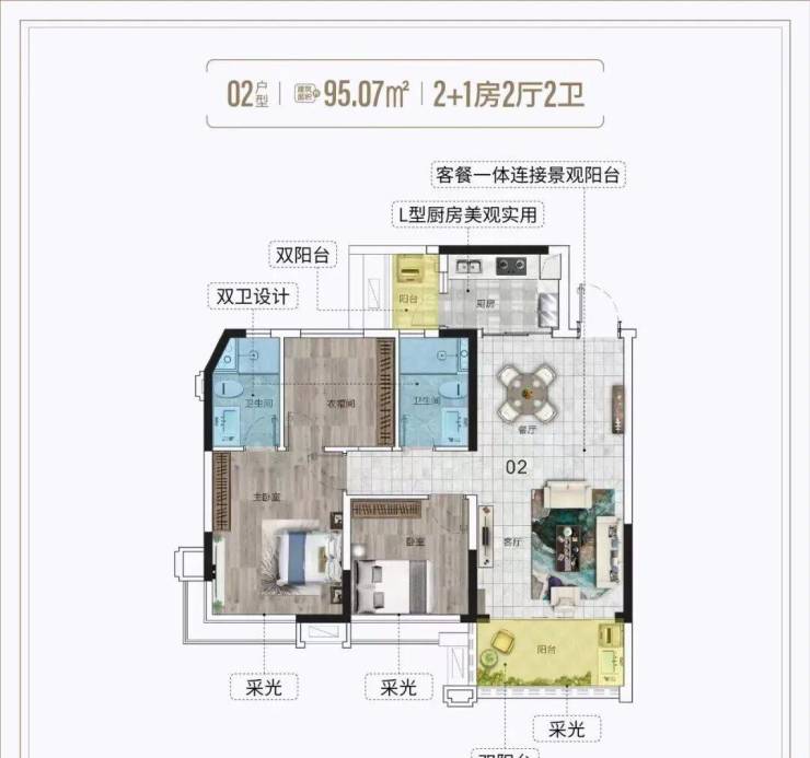 95平米三房两厅:单边位设计,多开间朝南,约10米南向采光面,阔景阳台无遮挡,可俯瞰中央园林,远眺城市景观。