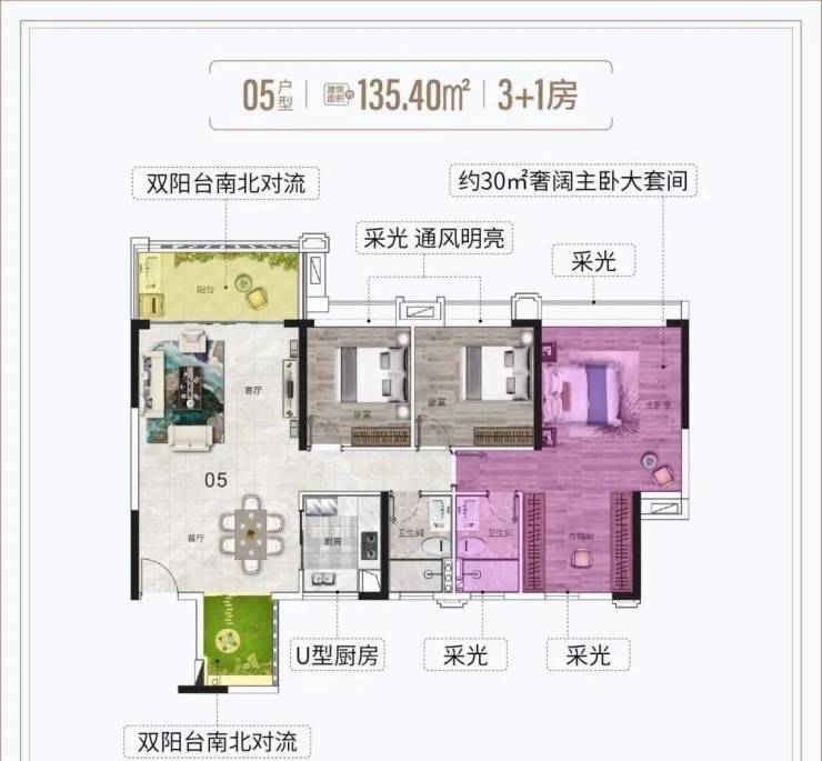 135平米3+1房两厅:四开间看珠江及小蛮腰,南北对流双阳台,宽敞明亮,主卧套间面积达约30平方米,畅享奢华生活体验。
