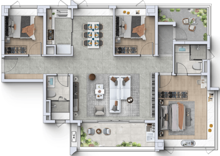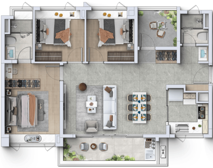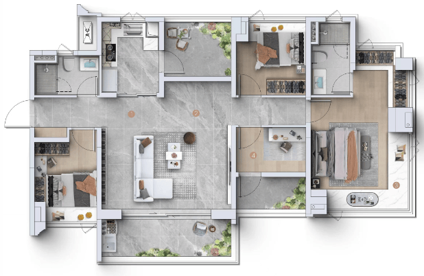 舒适105㎡户型:超6米阳台,动静分区合理,私密主卧套房设计,居住舒适。