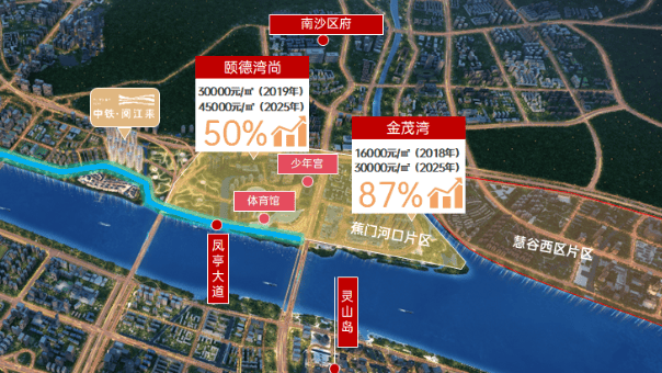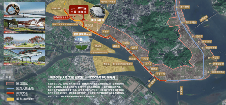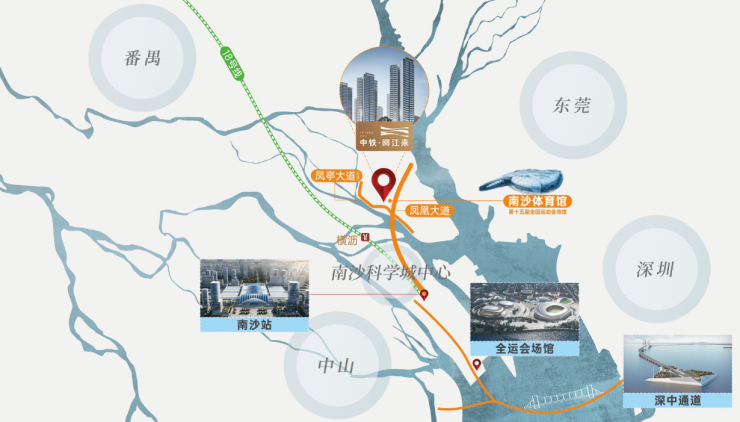 凤亭大道已通车:从项目出发仅需2分钟即可到达体育馆,5分钟可达南沙蕉门河中心及灵山岛CBD。