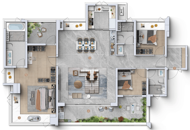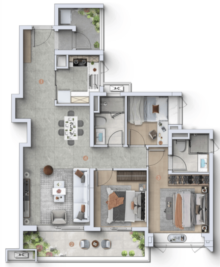 更高交标:全屋标配中央空调和子母门(仅限168㎡户型),并配备三大收纳系统和四大健康系统,全面提升生活品质。