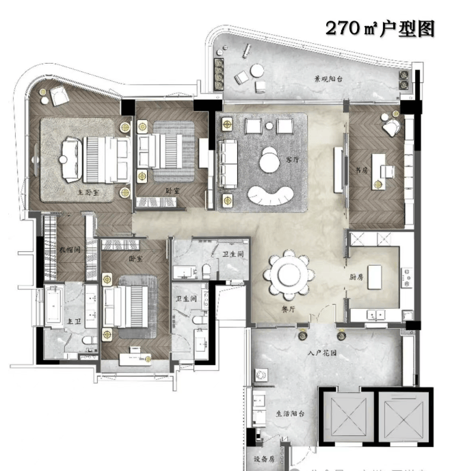 南天名苑占地约800亩(53万平方米),总建筑面积达到52.8万平方米,容积率仅为1.06,提供了约1200户住宅单位。项目特别注重居住舒适度,绿化覆盖率高,车位比为1:2,充分考虑到了居民停车需求。高层洋房采用4梯3户设计,层高达3.3米,提供从140平方米至270平方米不等的四房双主套户型选择。