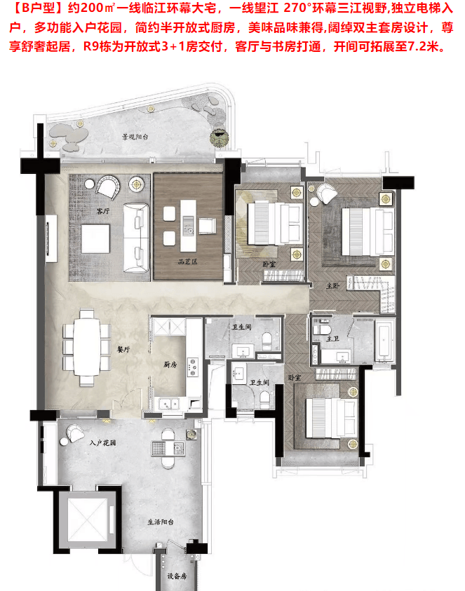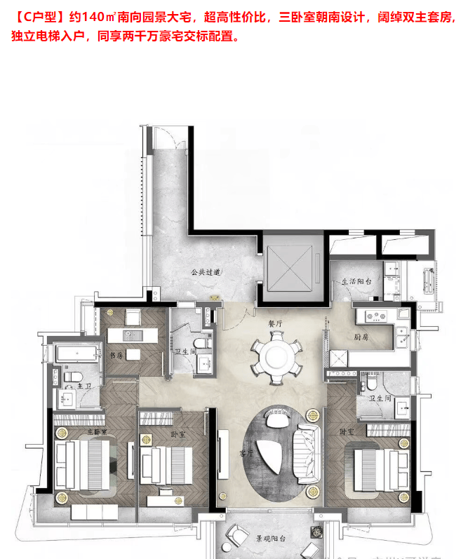 南天名苑推出了多种户型供选择,其中以A户型、B户型和C户型为代表。A户型为270平方米环幕江景四房,配备超大邮轮式阳台,尽享一线江景;B户型约为200平方米的一线临江环幕大宅,设计简约大气;C户型则是性价比极高的140平方米南向园景大宅,适合追求高品质生活的家庭。每种户型均采用了独立电梯入户的设计,保障了住户的私密性和舒适度。