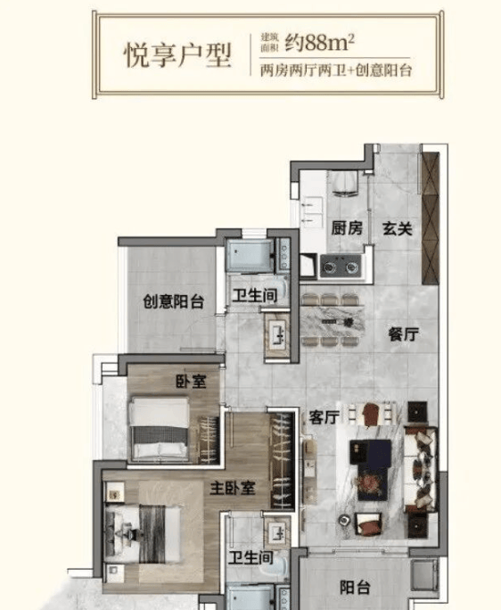 88㎡三房两厅一卫:紧凑实用,适合小家庭居住。