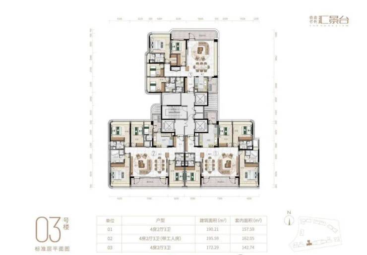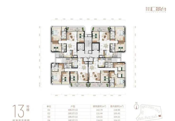项目由14栋12层小高层组成,产品涵盖123-352㎡三至五房,共8类户型,户型实用率约82-84%
