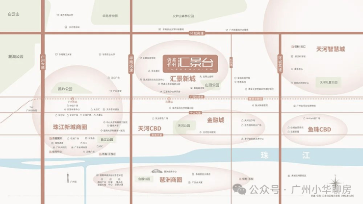 位居天河城央,南近珠江新城,北望火炉山,东望科韵路,西接汇景新城社区两公里景观中轴带,邻近科学城、智慧城、广东奥林匹克体育中心;广园快速、华南快速、深海高速环绕;
