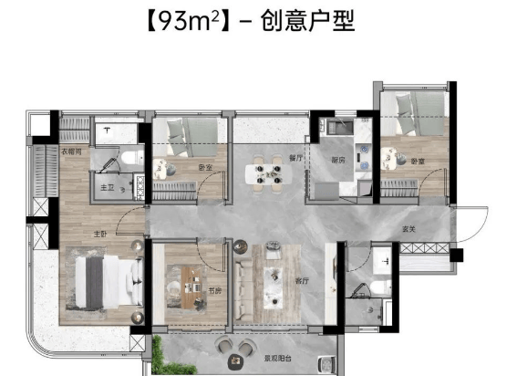 93㎡四房两厅两卫:东南向,使用率109%,独立入户玄关,南北通透,四面宽极致视野,主卧同样采用270°弧形玻璃幕窗。