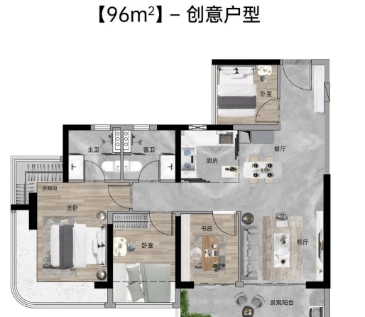 96㎡四房两厅两卫:西南向,使用率100%,约5.7米面宽瞰山阳台,主卧采用270°弧形玻璃幕窗。