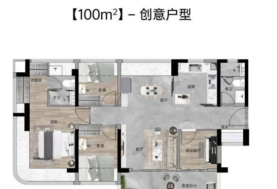 100㎡四房两厅两卫:西南向,使用率109%,南北通透,约6.1米巨幕阳台,主卧采用270°弧形玻璃幕窗。