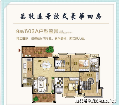 欧式豪华四房户型主打改善居住,户型面积宽敞,布局大气,装修风格精致,融合欧式奢华与现代舒适,适合人口较多的大家庭居住。户型南北通透,采光通风俱佳,客厅超大开间,连接超大观景阳台,视野开阔,可尽情享受社区美景;四间卧室布局合理,均配备宽敞飘窗,采光充足,主卧奢华大气,配备独立卫生间、衣帽间和观景飘窗,彰显业主的尊贵身份;次卧舒适宽敞,可满足老人、孩子的居住需求,还可预留一间作为书房、健身房或娱乐室,灵活适配家庭的不同需求;厨房、卫生间配套完善,细节设计贴心,全方位提升居住的舒适度与便捷度。