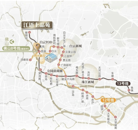 作为槎头TOD核心项目,江语上品苑的交通优势堪称“天花板级”。项目紧邻地铁12号线(已开通)、13号线二期(在建)与佛山8号线(规划中)三线交汇的西洲站,真正实现“电梯门到地铁门”的无缝衔接,属标准地铁上盖物业。12号线现已通车,可直达白云新城、珠江新城等核心商圈,30分钟内通达广州CBD;待13号线二期建成后,将进一步串联天河、黄埔等区域,大幅提升跨区通勤效率。
