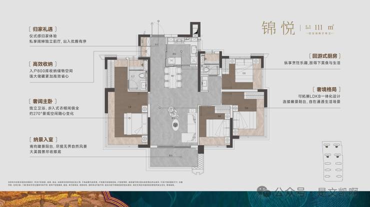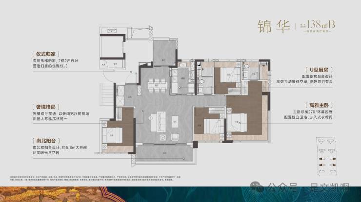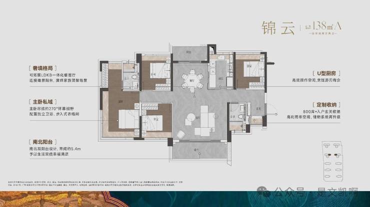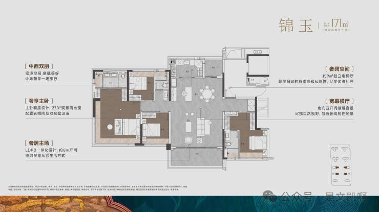 大户型建面约171㎡奢居四房,打造塔尖改善人居格局,双主套设计满足三代同堂居住私密性需求,270°全景落地窗搭配巨幕观景视野,尽揽社区园林景致。超大横厅格局搭配奢阔尺度,高端居家氛围感十足,独立储物空间、双台盆卫浴、定制化收纳系统等细节配置完善,从空间尺度到功能规划,全方位定义主城高端改善人居标准。