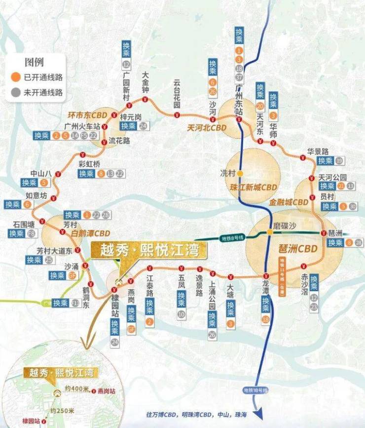 广州越秀熙悦江湾所处的地理位置,在公共交通层面具备显著优势。项目距离广州地铁11号线棣园站约250米,步行时间约3分钟;同时,距离广佛线燕岗站B口约400米,步行约5分钟即可抵达。这一“双地铁”配置,不仅提升了日常通勤的便捷度,更赋予了项目强大的区域辐射能力。