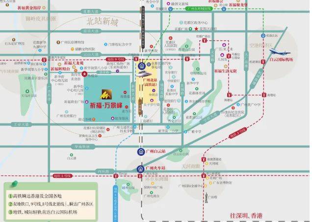 祈福万景峰占据广州北站旁的绝佳位置,尽享交通、商业、教育等多重优势。政府斥 275 亿巨资重点打造北站新城,片区发展潜力无限,未来将集聚高端商务、艺术会展等多元业态,吸引人流与资金流汇聚。项目周边交通网络发达,商业配套丰富,教育资源充足,再加上超 3 万㎡大型法式水景园林以及全现楼豪装发售的优势,无论是自住还是投资,都极具吸引力,是追求高品质生活与区域发展前景人士的理想之选。