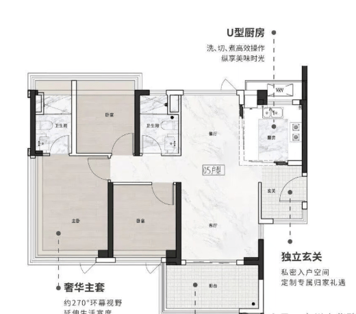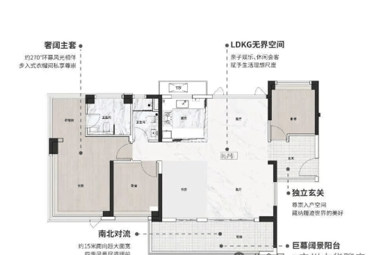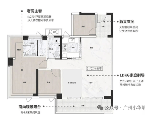 其中75㎡三房堪称“空间魔术师”:独立玄关可改造为储藏室,U型厨房操作空间充裕,主卧带独立卫浴并享270°环幕视野,南北对流确保全天采光通风。95㎡四房则采用LDKG一体化设计,串联餐客厅与约6.4米大阳台,打造无界互动空间;108㎡四房更实现约15米南向面宽,媲美顶豪尺度,主卧配置步入式衣帽间,私密性与功能性兼备。得益于广州新规,项目阳台占比合理,整体使用率最高达120%,在同面积段中遥遥领先,堪称“同户型天花板”。