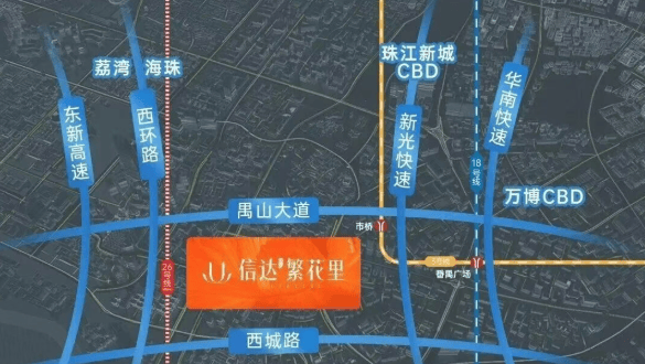 信达·繁花里位于番禺市桥老城区核心,紧邻禺山大道,周边西环路、东新高速、新光快速等主干道交织,自驾出行便捷——向东可快速抵达万博CBD,向北直通珠江新城,向西连接荔湾海珠,通勤效率高。目前距离地铁3号线市桥站约1.7公里,需借助公交或电单车接驳,但3号线无需换乘即可直达珠江新城、体育西路等核心商圈;1站至番禺广场还可换乘18/22号线,体验“湾区最快地铁”的高效出行。