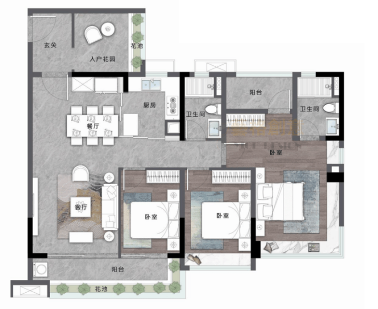 约78㎡ 2+1房2厅2卫:四开间采光,全明通透户型,配备约5.5米双面宽阳台,独立主套,开间达3.8M。