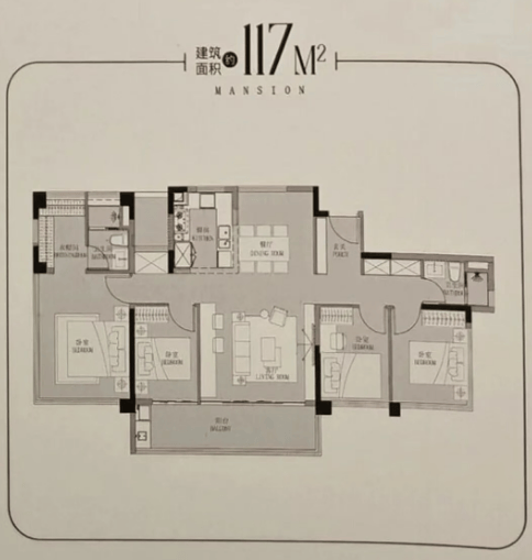 建面约117㎡五房:专梯专户设计,五开间朝南,约17.5米南向巨幅面宽,南北通透。