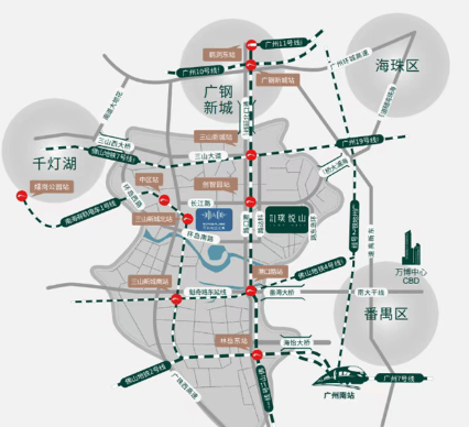 万科璞悦山坐落于三山新城的核心位置,紧邻广州番禺,距离广州仅一步之遥。尽管目前主要依赖自驾出行,但未来的交通规划包括11号线及跨江路等项目将极大地改善这一状况。周边环境静谧,东面有河涌和市政公园,距离文翰湖公园也只需7分钟车程。