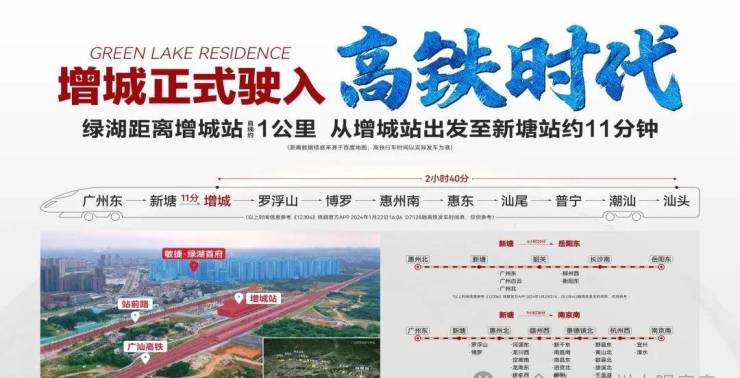 除了地铁,项目不远处的广汕高铁已正式通车,途经新塘、仙村、石滩等镇街,从石滩出发,可快速抵达广州东站、惠州、汕尾等地,极大地缩短了跨城出行的时间。对于经常需要跨城出差或出行的业主来说,高铁的开通无疑是一大福音。