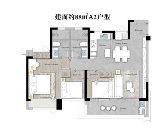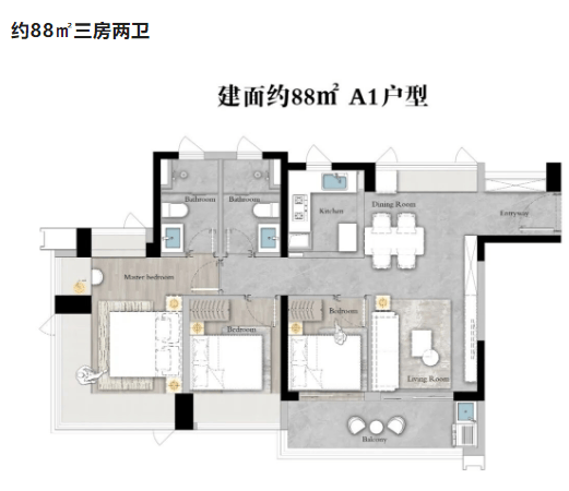 约88㎡三房两卫:紧凑实用的设计,适合小家庭居住,使用率达到100%,提供了舒适的居住空间。