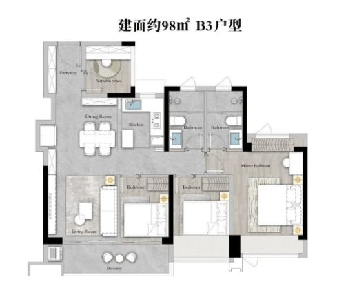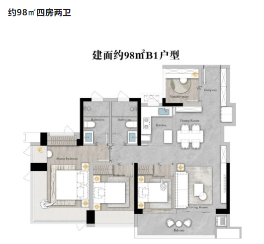 约98㎡四房两卫:更大的空间布局,适合追求宽敞生活的家庭,同样具备高效的空间利用率。
