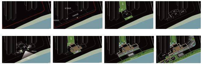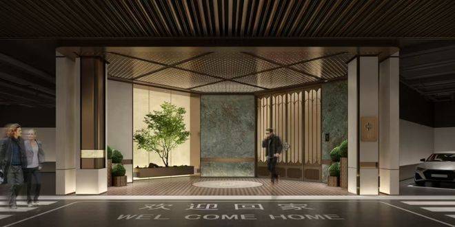 地上归家流线:街角艺术口袋公园——星光迎宾大道——滨河四季花汀——新南洋生活美学馆——风雨连廊(园林归家路)——主题架空层——单元门头——室内大堂——首层电梯厅——标准层电梯厅;