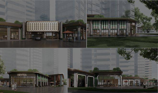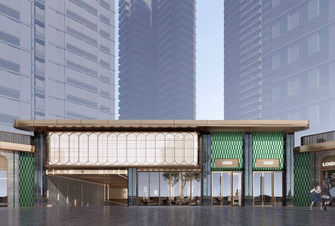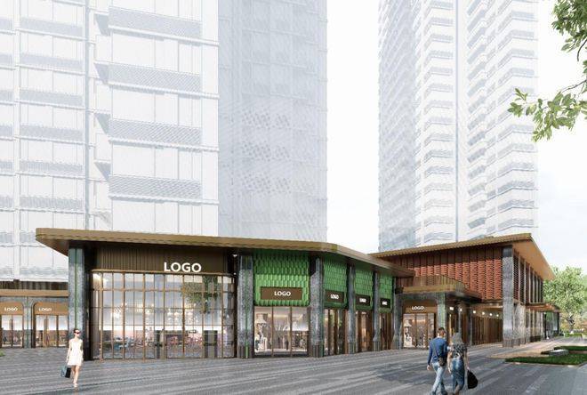 商业立面提取本地建筑中山大学怀士堂的形象意蕴与色彩肌理,整列式的壁柱复刻出广式骑楼的形态,砖红与复古绿的釉面陶板立面展现出岭南地区多样的建筑色彩。通过商业飘檐的连贯变化,丰富沿街近人尺度的立面节奏,营造“檐下”休憩、生活的温馨感受,同时隔绝塔楼的压迫感。展现出一种协调融洽、大气高级的创新商业格调。