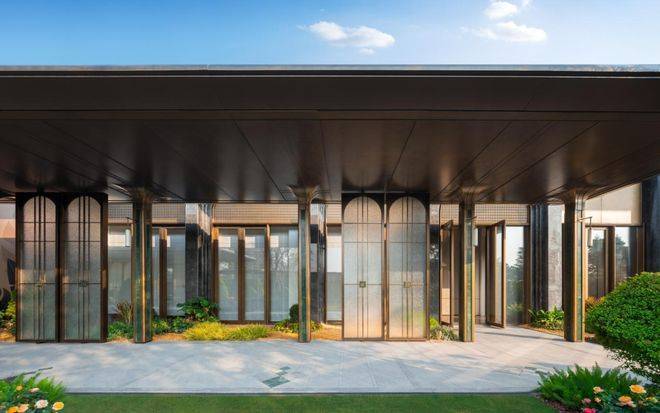高层立面采用现代简洁风格,采用连续性的玻璃窗墙体系和挺拔的金属线条勾勒出精致的体块边缘,竖向线条一直延伸至屋顶,形成严谨且创新的不对称立面秩序,整体建筑层次多样,有秩序且不缺乏灵动。塔楼基座延续社区仪式府门调性,采用东西融合的南洋风腔调,入口门头均架空两层,打造超尺度入户大堂,8米超高的空间体验,大尺度黄铜色铝板飘檐结合米白色圆角装饰柱,以及示范区同款金属装饰格栅共同造就了独特的归家体验。