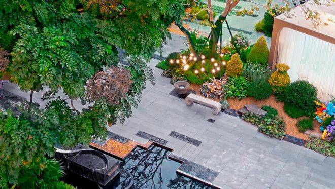 穿过水院,来到园区高潮点,高约14米,总面积达200方的台地花园会客厅。提取赖特流水别墅的层次穿插手法,在不同维度设置不同的停留点,形成类南洋巴比伦空中花园的文艺效果,为业主创造丰富的生活体验。