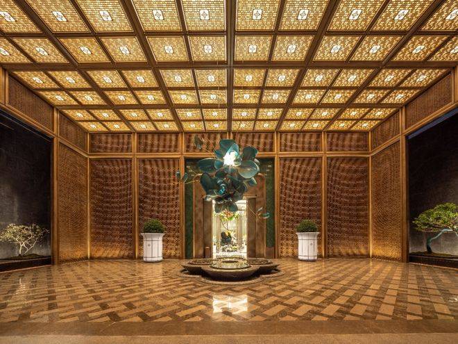 广州馥香园立足海珠文脉,融合岭南肌理与南洋美学,呈现出独特风貌;借鉴安缦酒店格栅语言,用中式编织营造东方气质与奢华氛围,用酒店式环岛前庭呈现大家族的从容与格调;