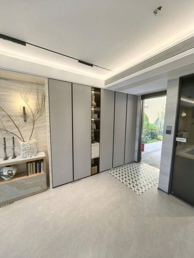 玄关:智能感应鞋柜内设可调隔板与通风孔,拉开即触发LED灯,兼具除菌散味功能;