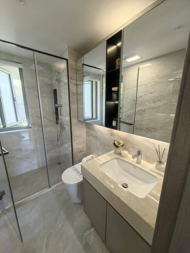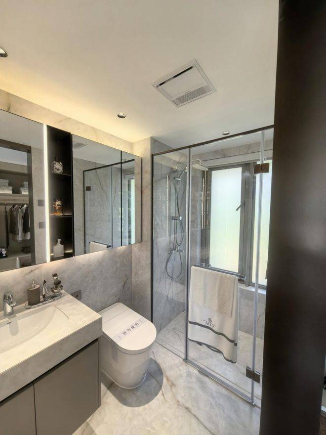 卫浴:高仪龙头花洒、恩仕半智能马桶搭配智能镜柜,触摸除雾与镜背收纳兼具功能与美观。