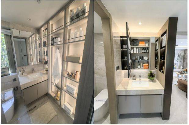卫生间:镜背收纳柜集成触摸除雾、美妆冰箱与一体收纳架,打造美妆护肤专属空间。