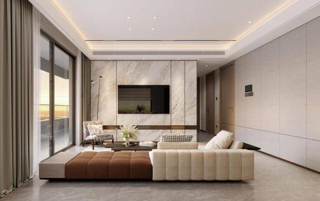 客厅:岩板背景墙与护墙板组合,以材质碰撞营造轻奢氛围。