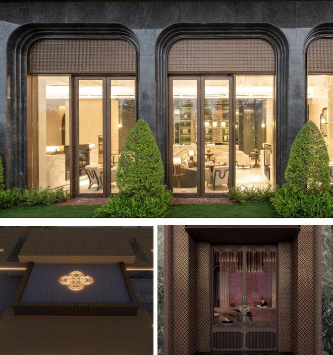 以东方岭南风格与西式风格相融合,打造东西融合的南洋风腔调。立面采用对称式构图,入口部分强调大气宽阔的空间感受,以及富有序列感的两侧圆弧柱廊,形成超级门府的气质形象。整体空间层次丰富:入口打造酒店式落客前场,再进入到仪式光庭,光庭两侧均有意境庭院形成对景,再通过精致光厅进入内部大堂,形成步移景异、多重院落的空间感受;