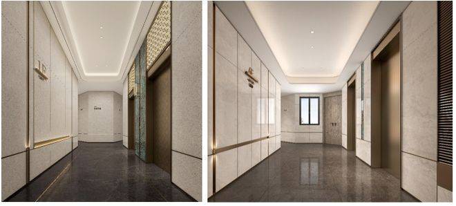 在新规条件下,结合周边项目的充分对标研判,通过优化设计的方式,在同等面积户型条件下,极大的提升了居住舒适度,并通过设置270°转角凸窗、大面宽玻璃实现更高的采光通风条件。并公区也实现了电梯厅采光通风对流的环境,增加入户体验感;