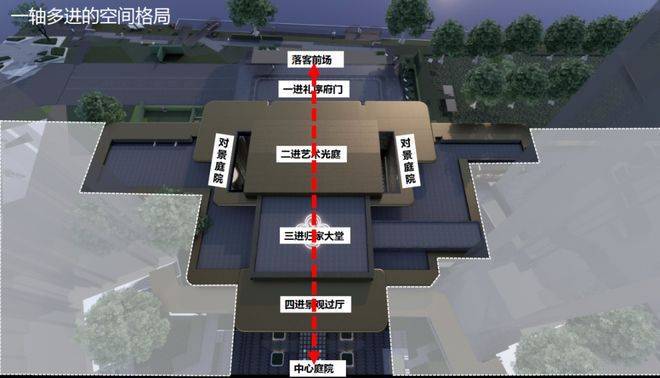 以‘一轴多进’传统空间礼序为原型,通过当代转译构建‘轴-带-十进序列-六园系统’的多维空间结构,实现从仪式感迈向沉浸式的居住体验迭代——在垂直与水平维度同步展开移步异景的动态场景叙事;