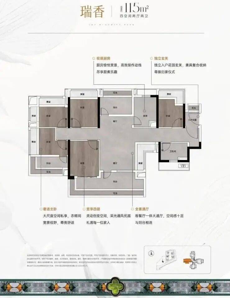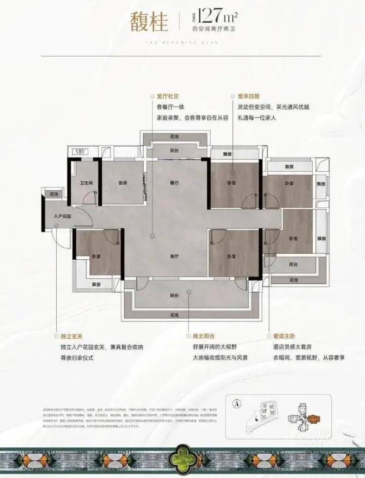 主力户型集中在85–128㎡,全部朝南,实用率普遍超过85%。我重点看了建面约102㎡的样板间,LDKB一体化格局让整个公共区显得特别通透。主卧带270°转角飘窗和步入式衣帽间,在同面积段里算得上惊喜。而127㎡的四房更是做到双阳台——一个观景、一个家政,生活动线清晰不交叉,收纳细节也考虑周全,比如玄关预留了整面储物柜位置。