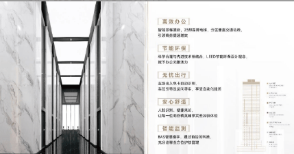依托地标建筑的高端定位,项目公区空间以精奢美学为设计内核,融合现代极简建筑风格与国际高端设计审美,打造沉浸式高端商务场景,从入户大堂、公共廊道、电梯空间到景观过渡区域,每一处细节皆匠心雕琢,以材质、工艺、光影的巧妙结合,诠释当代商务奢雅格调。项目首层打造五星级双入户大堂,首层大堂约10米奢阔挑高,空间开阔通透,尺度感十足,搭配流线型美学设计,弱化硬质建筑的冰冷感,营造大气雅致的入户仪式感。墙面甄选意大利进口奢石材质,曲面工艺精细打磨,质感细腻高级,结合简约线性灯光布局,光影错落交织,提升空间层次感与高级氛围,第一眼便能感受到塔尖场域的尊贵气场。