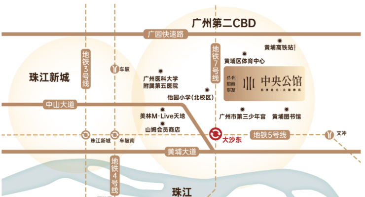 项目距离地铁5号线大沙地站直线距离约500米,并且未来可通过5号线和7号线二期实现多线路换乘,快速直达珠江新城、琶洲会展中心及长隆万博等核心节点。项目周边道路规划完善,交通网络高效,能够有效节省日常通勤时间。此外,北侧规划中的黄埔高铁新城将引入大型商业综合体及创新产业平台,未来交通出行和商务活动的便利性将进一步增强,使居民能够在居住与工作之间获得平衡,形成高效、舒适的都市生活节奏。