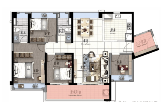 【南北对流阔绰四房】140㎡4房2卫:采用LDK一体化联厅设计,空间通透开阔,是亲朋聚会的理想场所。南北通透,空气对流顺畅,居住健康舒适;客厅近6米超大进深,搭配阳光入户花园,让生活多一份惬意;阔绰主卧套房设计,提升居住私密性与尊贵感。