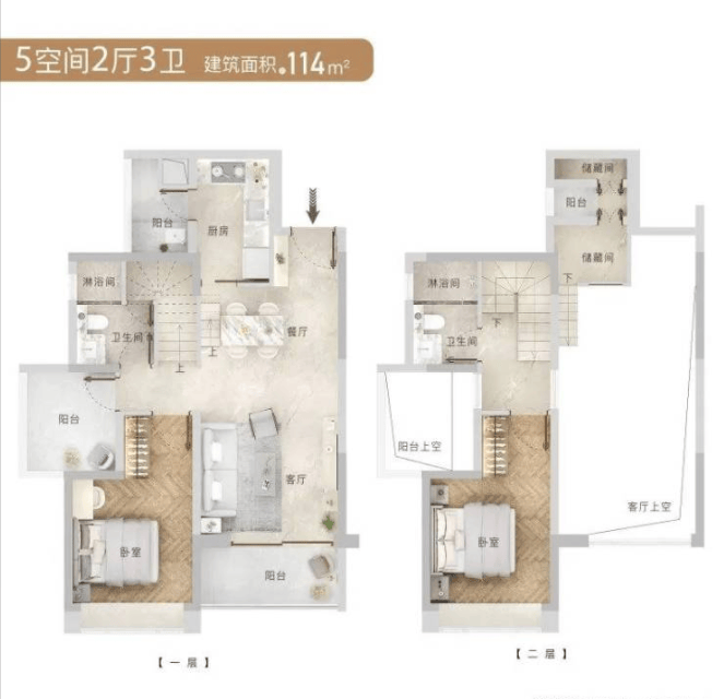 110㎡五房两厅两卫,总价660万-750万,是复式产品中的刚需款。该户型上下两层独立分区,动静分离,上层为休息区,下层为活动区,能有效避免休息和活动之间的干扰;空间利用率高,110㎡的面积能做到五房设计,能满足多子女家庭的居住需求;客厅连接景观阳台,采光通风出色,视野开阔;主卧自带独立卫生间,私密性强,能为业主提供舒适的居住体验。