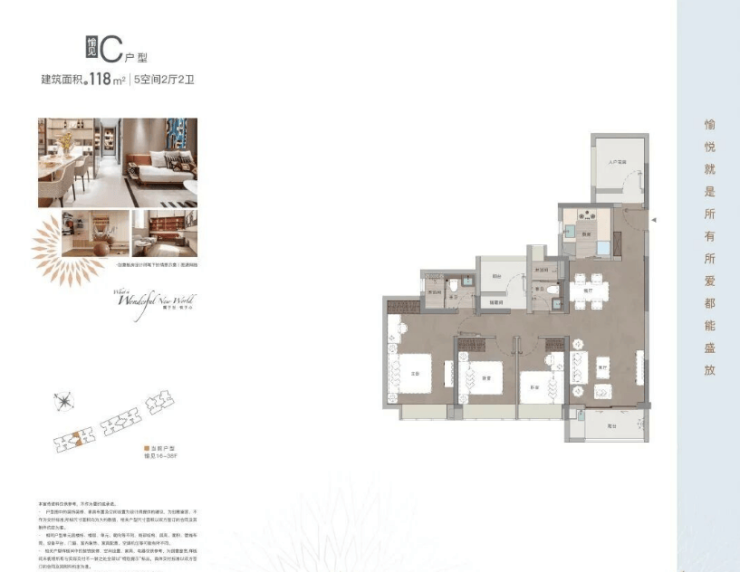 118㎡五房两厅两卫,总价640万-710万,适合大家庭居住。该户型空间宽敞,布局舒展,五房设计能满足多子女家庭或三代同堂的居住需求;客厅采用大面宽设计,采光通风出色,连接景观阳台,能欣赏到小区的园林绿化,日常休闲和接待客人都十分方便;厨房采用L型设计,操作空间充足,能满足多人同时烹饪;五个房间大小适中,布局合理,主卧自带独立卫生间和衣帽间,私密性强,能为业主提供舒适的居住体验。